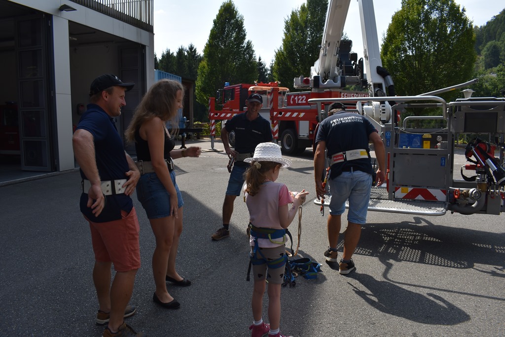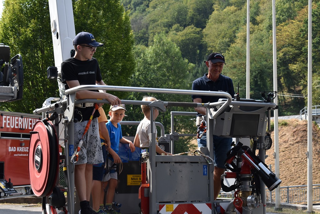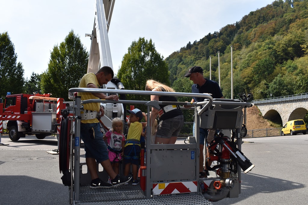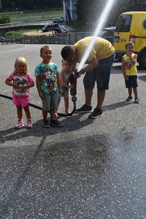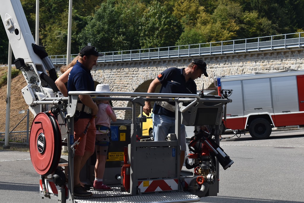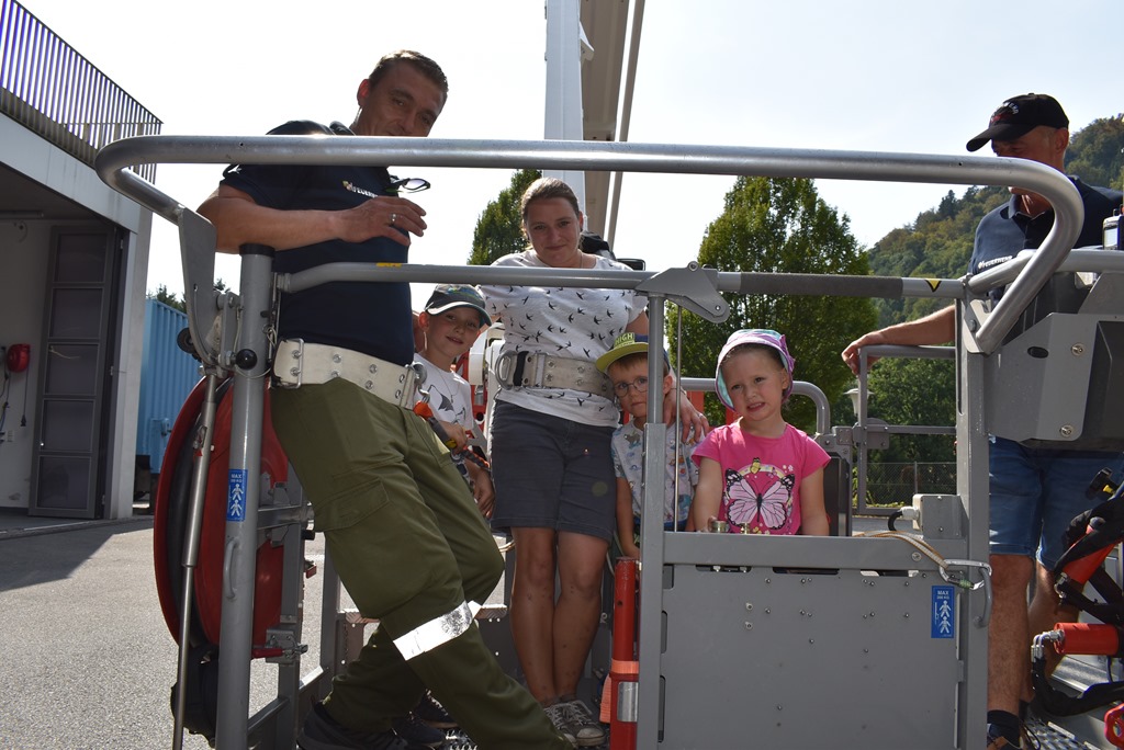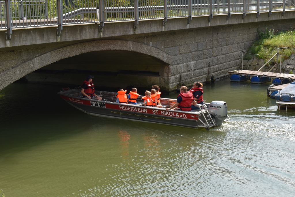 Besichtigung der Feuerwehrautos mit Rundfahrten; Wie gehe ich mit dem Funkgerät um ?; Bootsfahrt und das Highlight mit dem HUB ganz nach oben und St.Nikola von einer anderen Perspektive sehen.