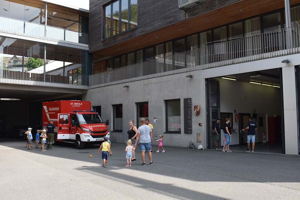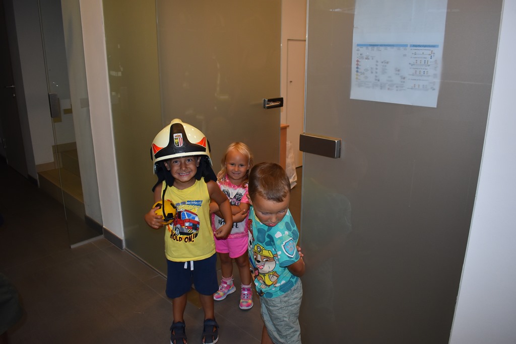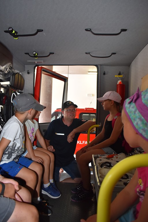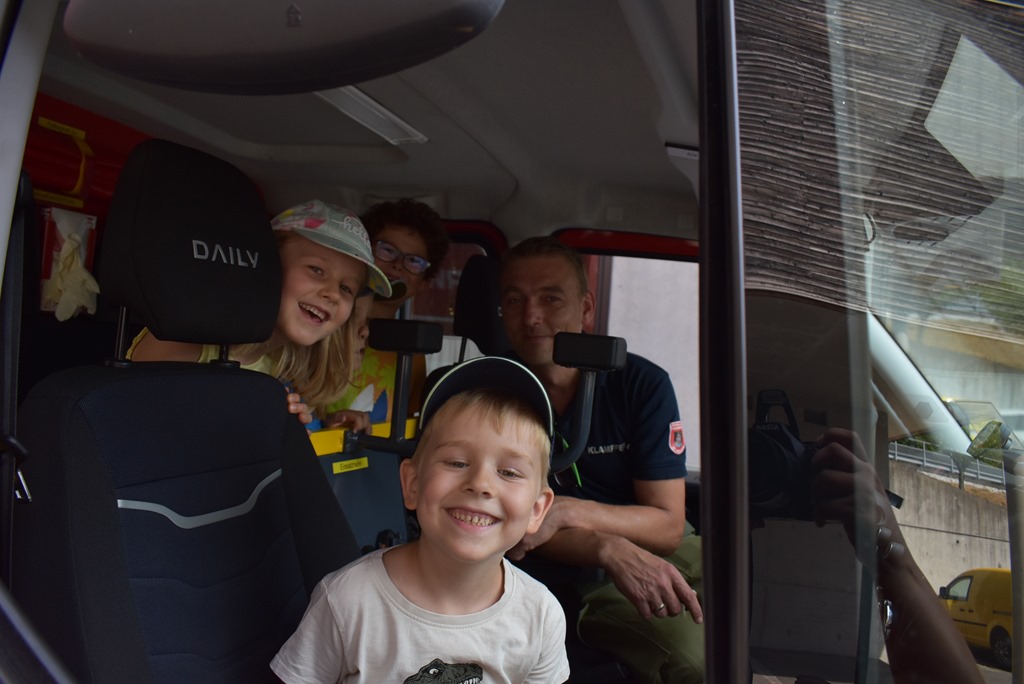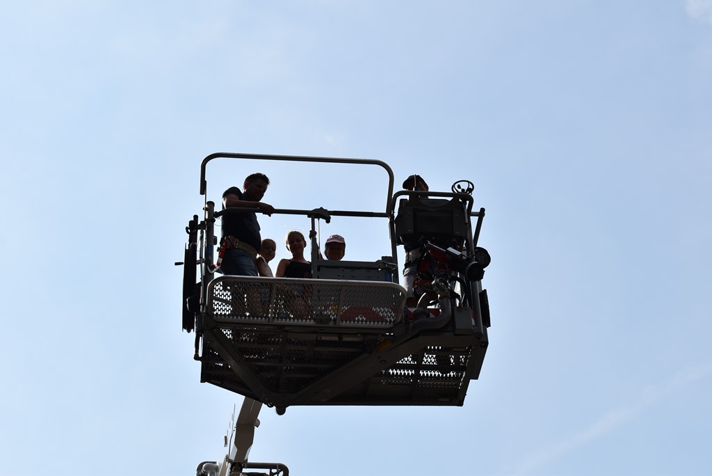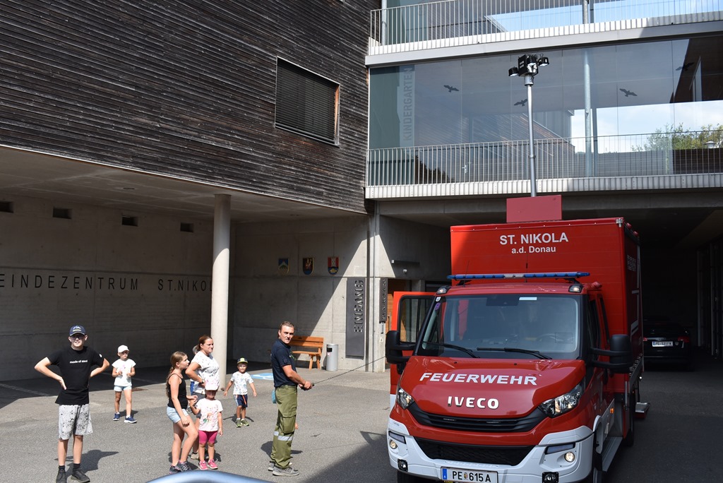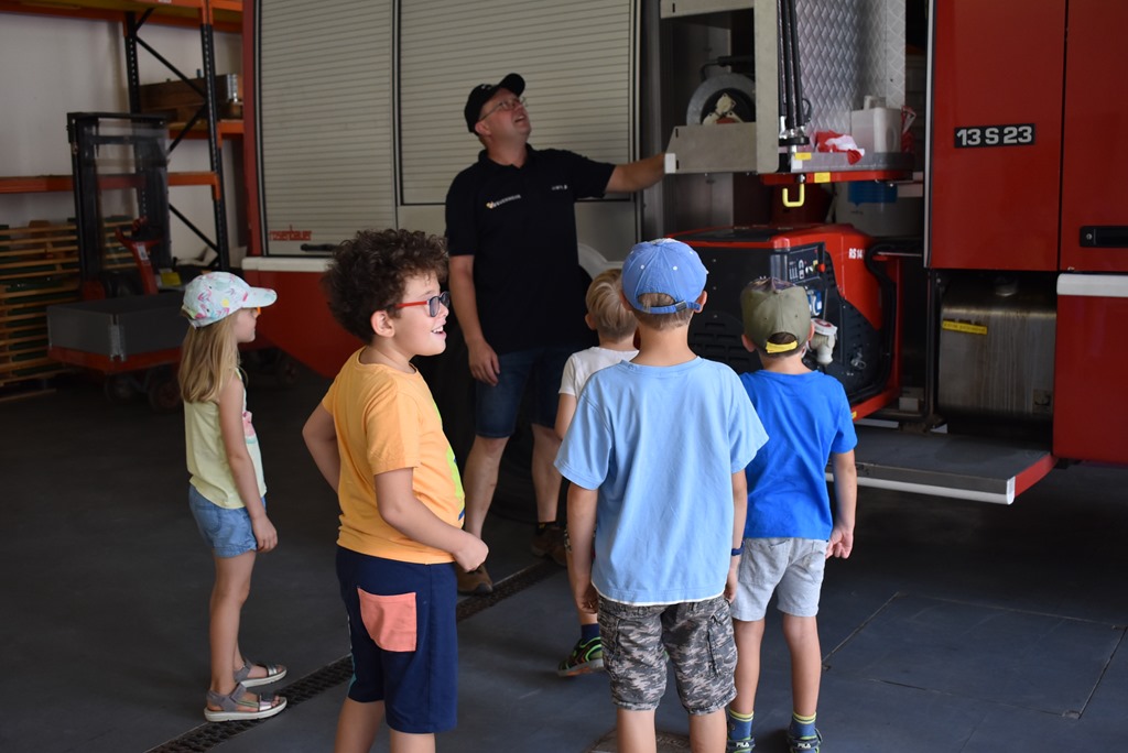 Besichtigung der Feuerwehrautos mit Rundfahrten; Wie gehe ich mit dem Funkgerät um ?; Bootsfahrt und das Highlight mit dem HUB ganz nach oben und St.Nikola von einer anderen Perspektive sehen.