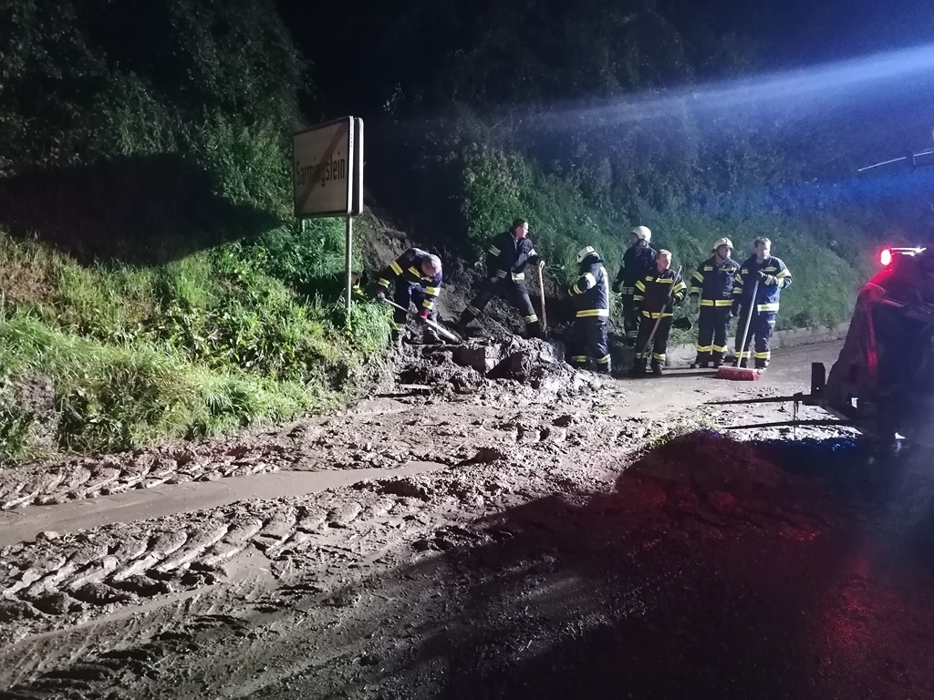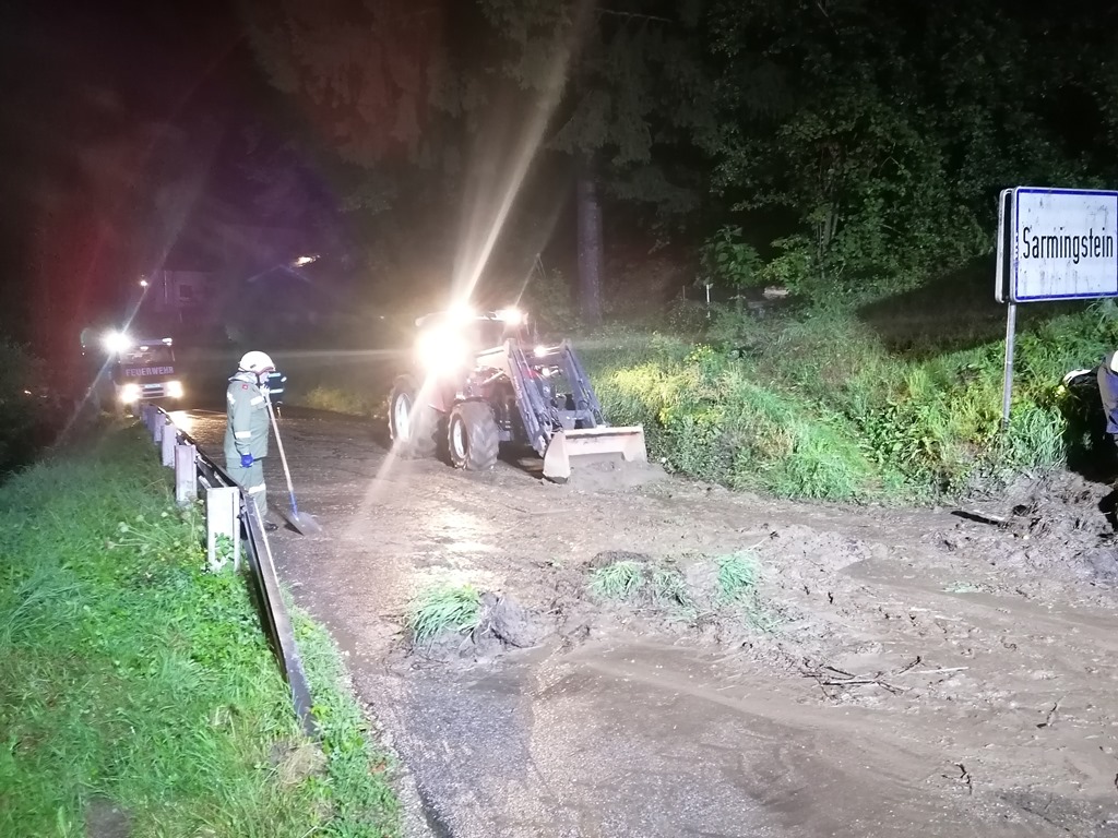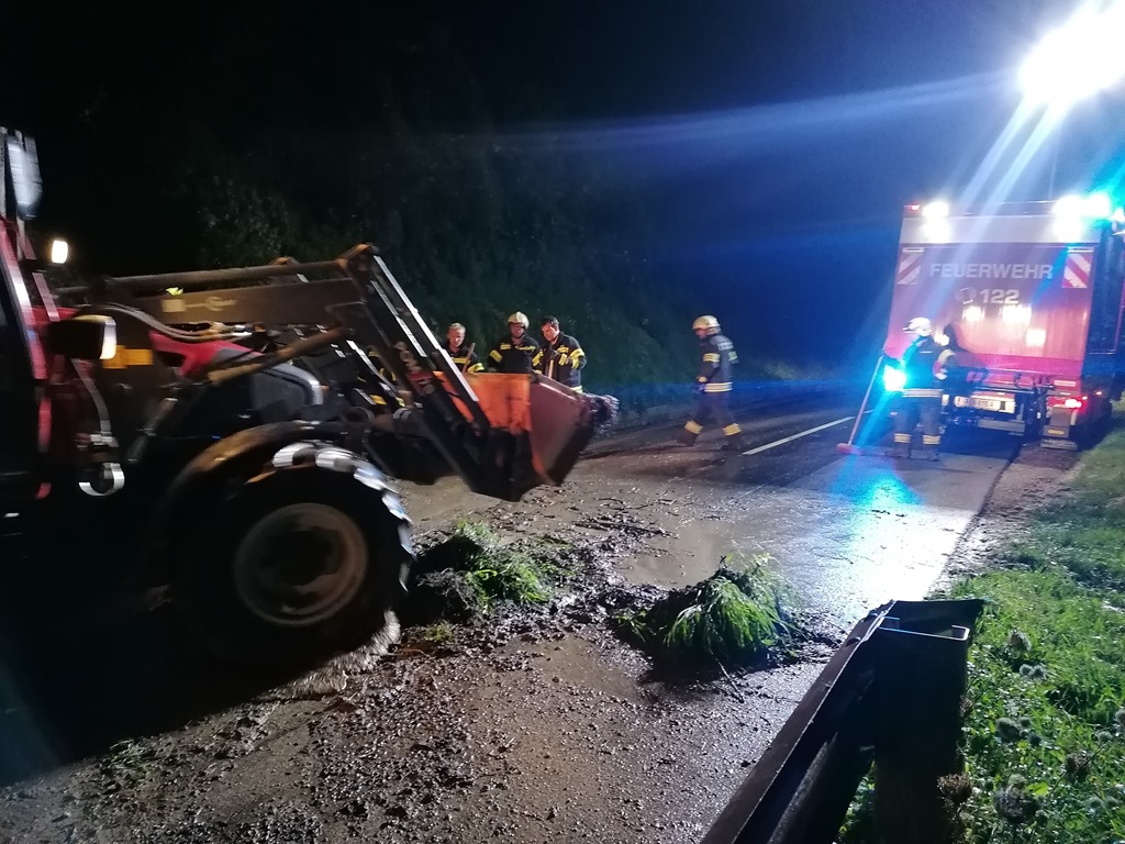 Am 16. August rutschte nach Starkregen eine Mure auf die Landesstraße bei Sarmingstein. Wir fuhren mit einer Besatzung KLFA-L zum Einsatzort und erkundigten die Lage. Wir forderten das TLF und einen Traktor mit Frontlader zur Einsatzstelle nach. Nach ca. 2 Stunden Reinigung der Fahrbahn rückten wir wieder ins Zeughaus ein.