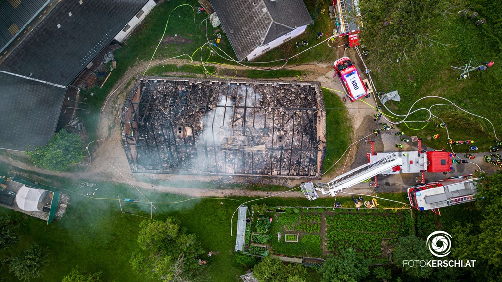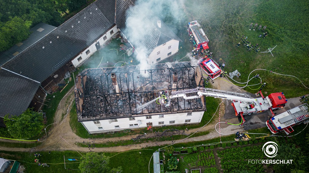 Mit mehreren Löschleitungen wurde das Feuer von außen bekämpft. Das Löschwasser musste aufgrund der abgelegenen Lage des Einsatzortes mit Hilfe von Landwirten und deren Güllefässern zur Einsatzstelle transportiert werden. Dadurch konnte der Brand rasch unter Kontrolle gebracht werden. Zudem lieferte eine Drohne wichtige Wärmebilder aus der Vogelperspektive. Verletzt wurde niemand. Der Dachstuhl wurde mit einem Kran durch die Feuerwehr abgetragen. Die Brandursache wird derzeit noch von einem Brandsachverständigen ermittelt. An die 150 Kräfte der Feuerwehr standen bzw. stehen per 21.30 Uhr noch im Einsatz.