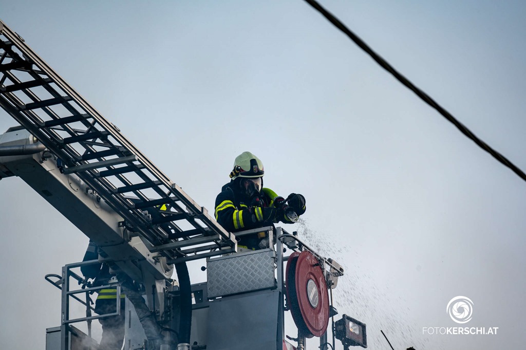 Die Teleskopmastbühne aus Perg wurde für die Brandbekämpfung von oben eingesetzt.